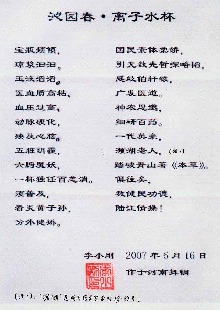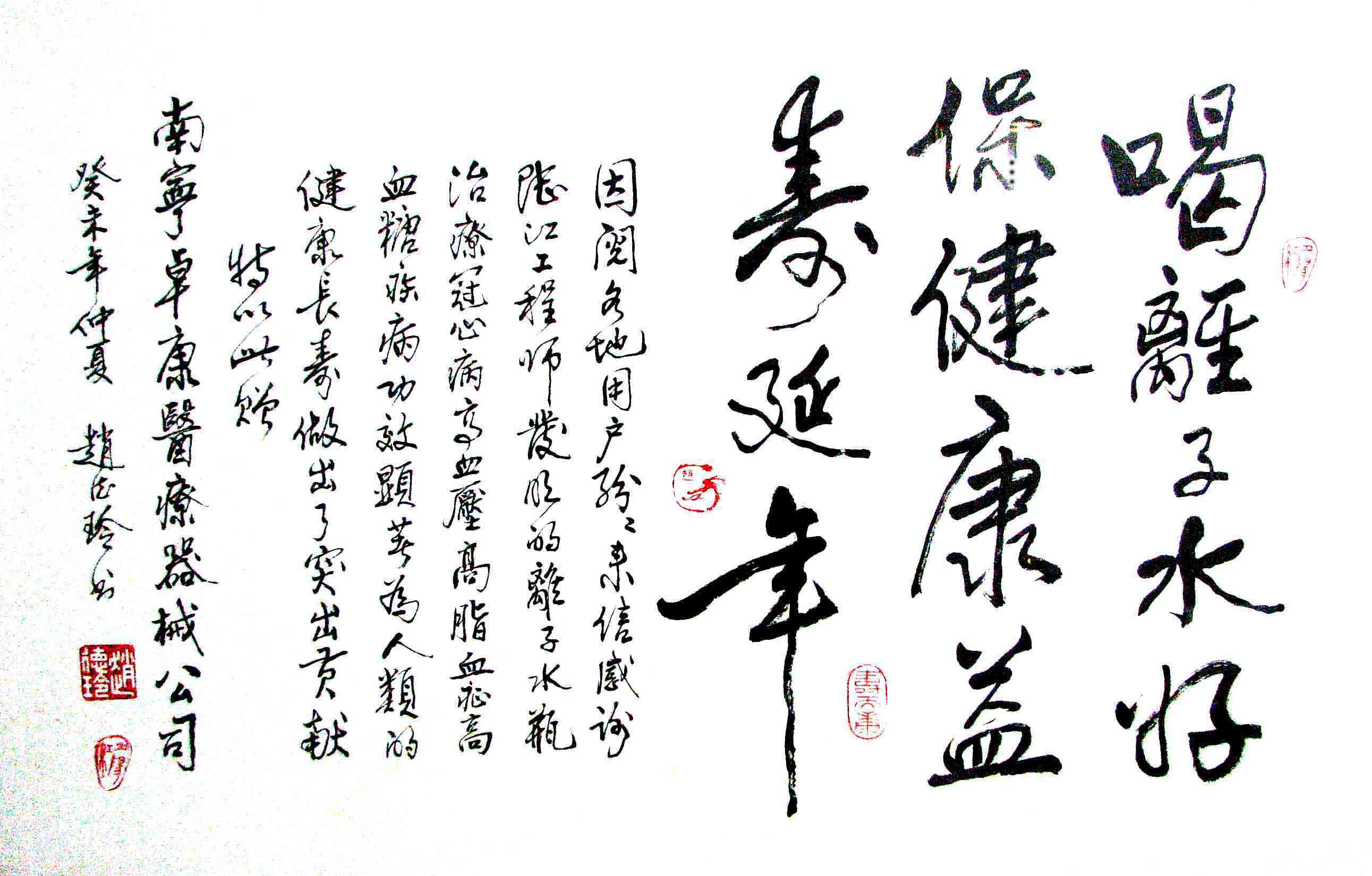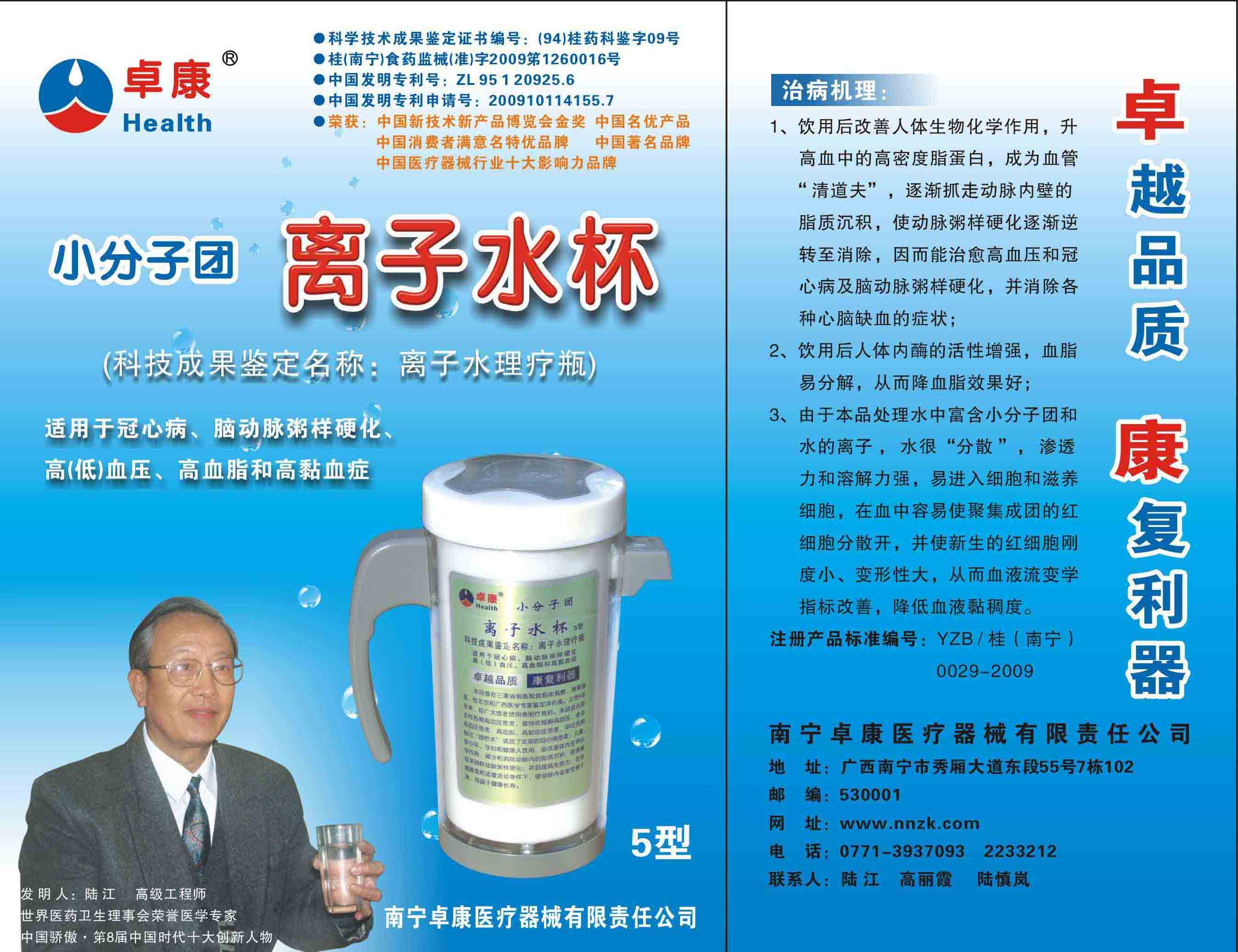 -----我是從事建筑的高工,本來沒有資格去攻克醫(yī)學(xué)難題,卻為了自身健康才扣響醫(yī)學(xué)的大門。由于我1990年患高血壓,因怕中風(fēng)才研究發(fā)明了離子水瓶,我把水處理成微小分子團(tuán)水,飲用后治愈了高血壓。便于1993年底送到三家省級(jí)醫(yī)院做臨床試用4個(gè)月。經(jīng)北京和廣西醫(yī)學(xué)專家鑒定:"降脂降壓效果好"," 能擴(kuò)大心腦動(dòng)脈流量,改善心腦電圖以及微循環(huán)","對(duì)治療心腦動(dòng)脈粥樣硬化、高血壓、高血脂有良好的醫(yī)療保健作用。""產(chǎn)品的技術(shù)性能和療效達(dá)到了同類產(chǎn)品的國(guó)內(nèi)領(lǐng)先水平,經(jīng)廣西醫(yī)學(xué)科學(xué)情報(bào)研究所檢索,未見國(guó)外有類似報(bào)道。"中國(guó)醫(yī)學(xué)科學(xué)院張正國(guó)教授從美國(guó)國(guó)立醫(yī)學(xué)圖書館數(shù)據(jù)庫(kù)存Medline檢索英俄文資料,均未見類似報(bào)告。2000年上市后,我為了對(duì)消費(fèi)者負(fù)責(zé)而繼續(xù)觀察研究,一直通過《信譽(yù)卡》和《質(zhì)量跟蹤調(diào)查書》向患者承諾療效,請(qǐng)用戶使用6個(gè)月后反饋效果。和脂壓患者飲用2至5個(gè)月內(nèi),消除癥狀,停服藥物,血壓正常;冠心病患者飲用3~5個(gè)月逐漸減輕至消除心絞痛、房顫等癥狀,不再服藥,飲用1年左右心電圖正常,經(jīng)冠脈造影掃描無(wú)明顯狹窄,表明冠心病痊愈。大量患者還反映許多衰弱器官被修復(fù),讓前列腺增生、慢性咽喉炎、慢性氣管炎、支氣管炎、慢性胃炎、腸炎和膽囊炎等不藥而愈;2型糖尿病患者是因?yàn)橐葝u衰弱致病,飲用該水半年至一年,逐漸減藥至停藥,血糖尿糖正常,真正治愈2型糖尿病。中風(fēng)后遺癥患者飲用六七個(gè)月,可逐漸減輕至消除肢體和語(yǔ)言障礙,表明飲用該水能讓壽命很長(zhǎng)的神經(jīng)元細(xì)胞逐漸修復(fù),奇跡般地恢復(fù)肢體和語(yǔ)言功能。飲用后還使胸腺和脾臟兩個(gè)重要的免疫器官被修復(fù)和增強(qiáng),產(chǎn)生免疫細(xì)胞多,提高了免疫力,使人不生病或少生病。自此, 飲用微小分子團(tuán)水創(chuàng)造了攻克冠心病、高(低)血壓和糖尿病三大醫(yī)學(xué)難題的奇跡。人們對(duì)此感到不可思議,但實(shí)踐是檢驗(yàn)真理的唯一標(biāo)準(zhǔn)。